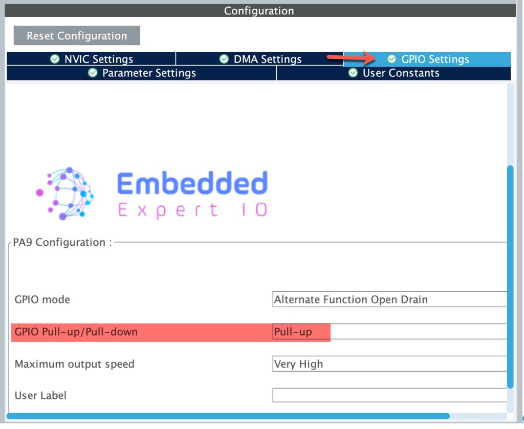 Next, from GPIO Settings, enable the Pullup resistor as follows: