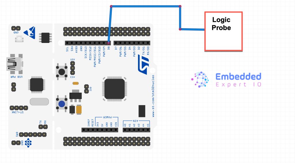 By connecting logic probe to pin PA9 (D8 of Arduino connector):