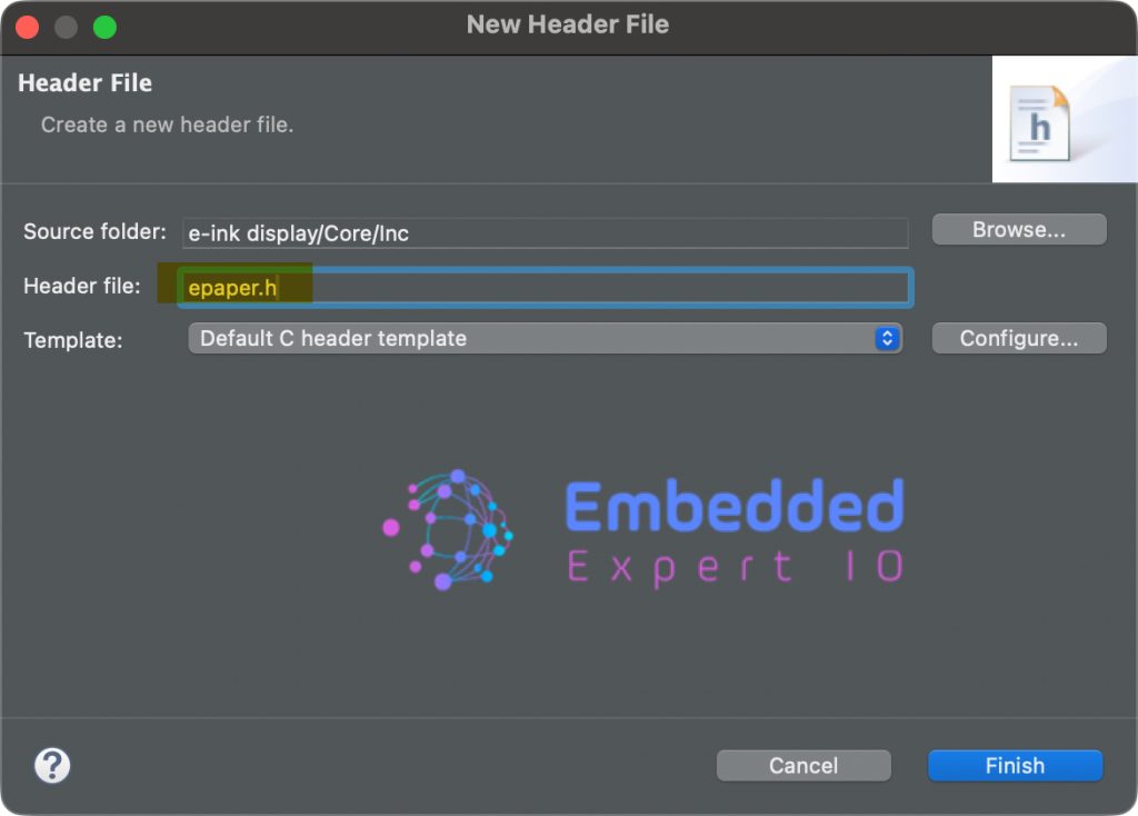 In similar manner, right click on Inc folder and add new header file with name of epaper.h.