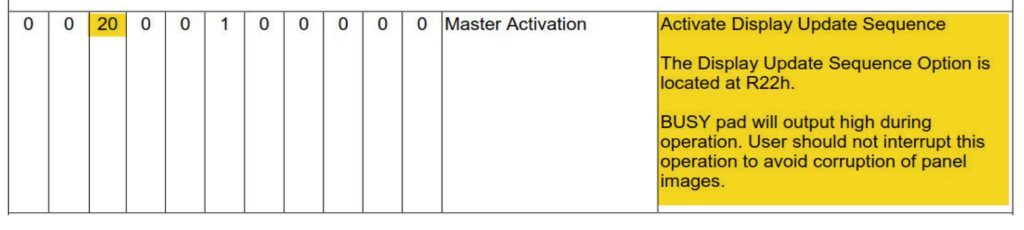 }Next, we need a function to update the display after filling the GRAM of the display. This can be done by sending command 0x20 and wait until BUSY line becomes low: