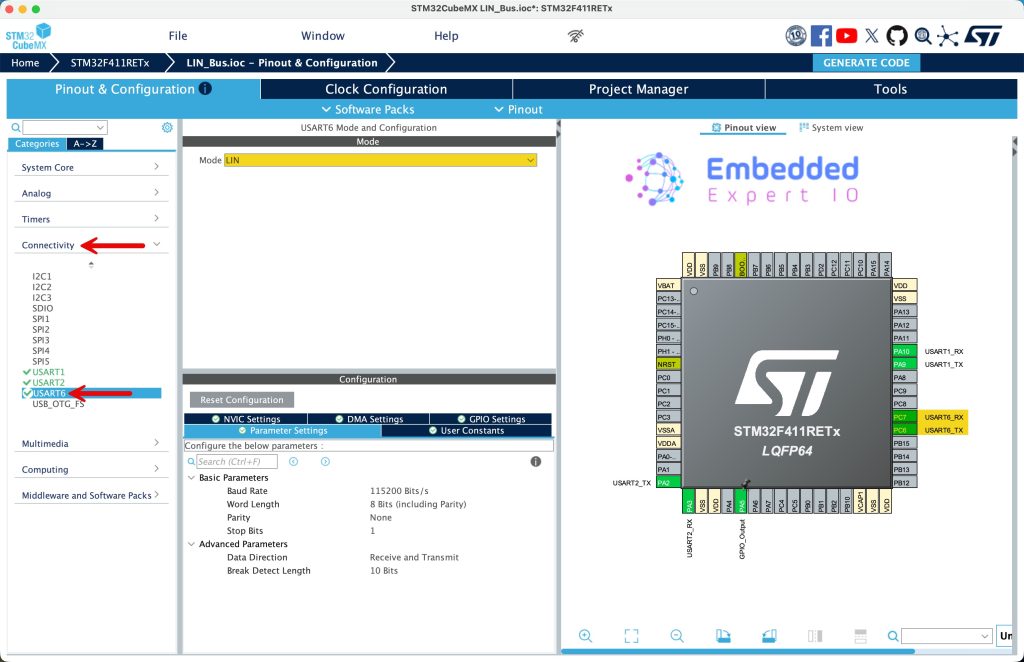 Once the project has been opened, enable USART6 in LIN mode as follows:
