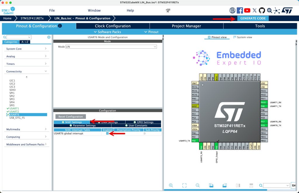 Next, from NVIC Settings, enable global interrupt for USART6, once it has been enabled, click on generate code as follows:
