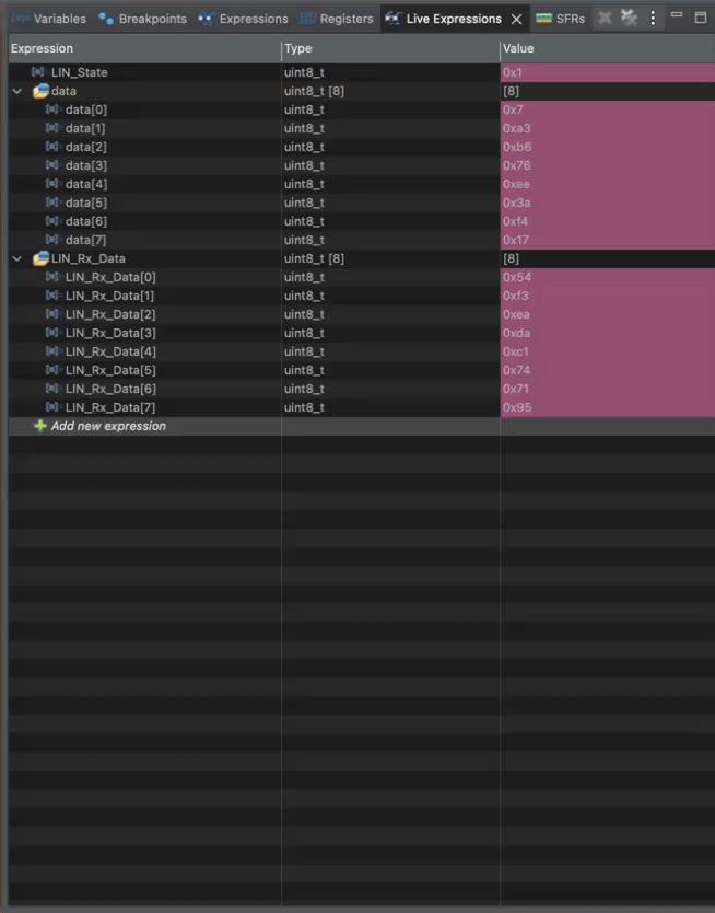 In live expression of the debug session, add data and LIN_Rx_Data to live expression.