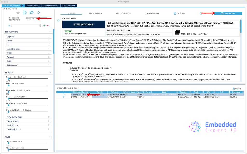 Search for your STM32 MCU, select the MCU and click on Start New Project as follows: