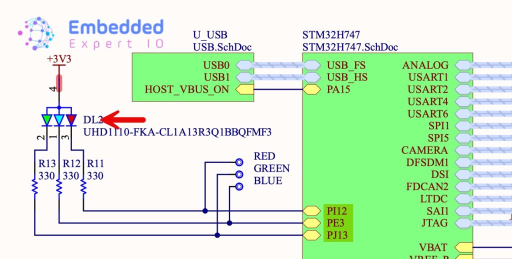 Since this guide uses STM32H747XI in Arduino Giga R1 WiFi, we shall use the onboard LEDS to be controlled by each core.