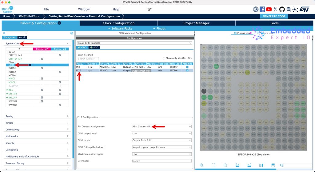 Next, from system core, select GPIO and assign PI12 (Blue LED) to Cortex M4 as follows: