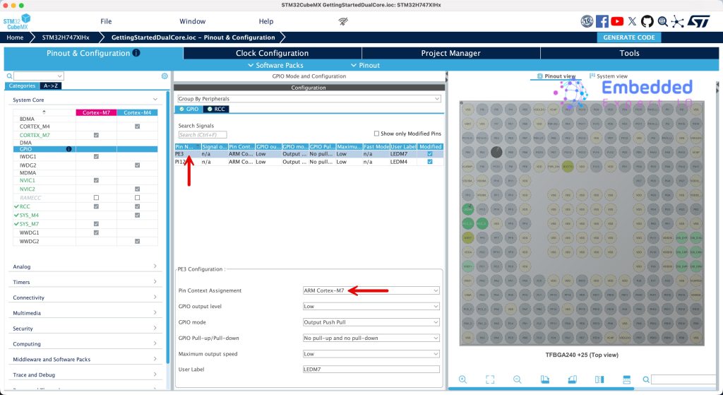 Set PE3 as output and give it a name of LEDM7 which will be configured for Cortex M7.