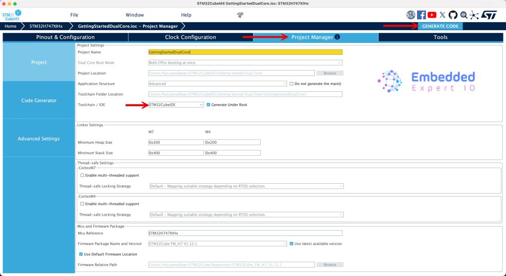 Next, From Project Manager, give the project a name and set the toolchain/IDE as STM32CubeIDE and click on generate as follows: