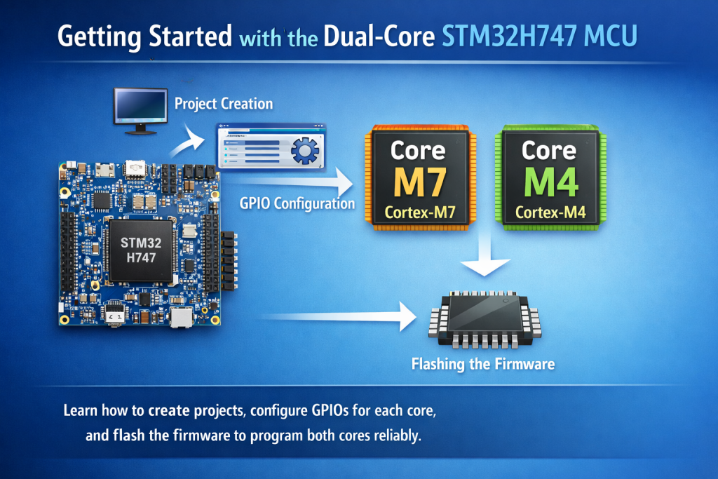 This guide provides a concise introduction to getting started with the dual-core STM32H747 MCU, focusing on project creation, core-specific GPIO configuration, and firmware flashing. It explains the fundamental steps required to correctly assign resources to each core and program both cores reliably.