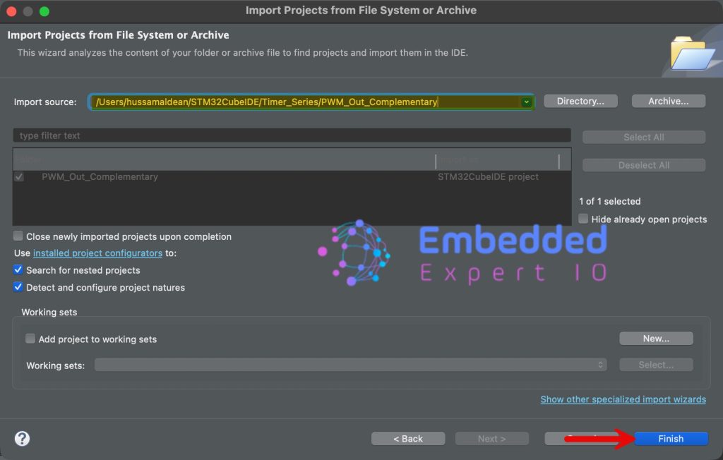 Next, select the folder that contains the .ioc file and click on Finish as follows: