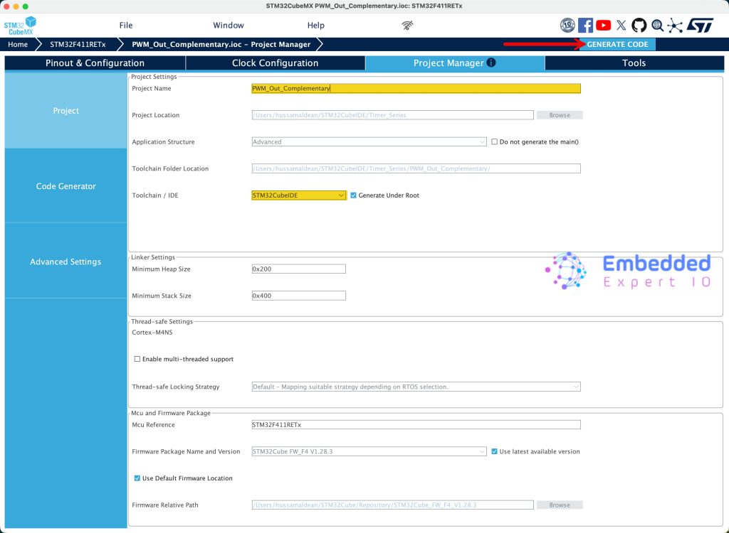 Give the project a name, set the location, set toolchain/IDE to STM32CubeIDE and click on Generate Code.