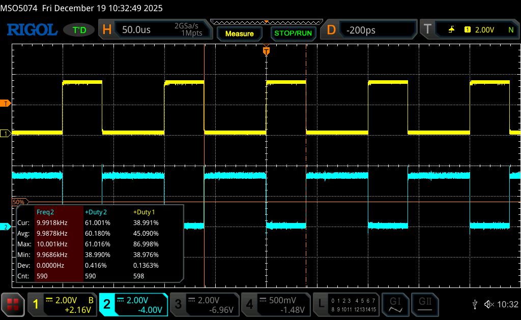 Duty cycle of CH1 is 39% as we set it in the configuration (Yellow trace).