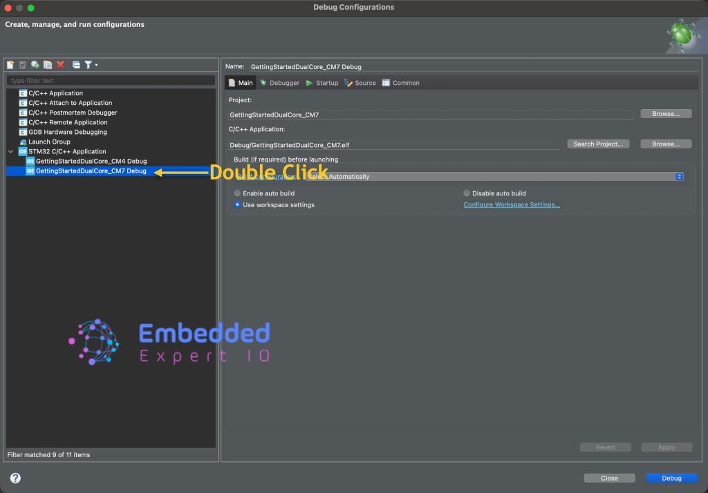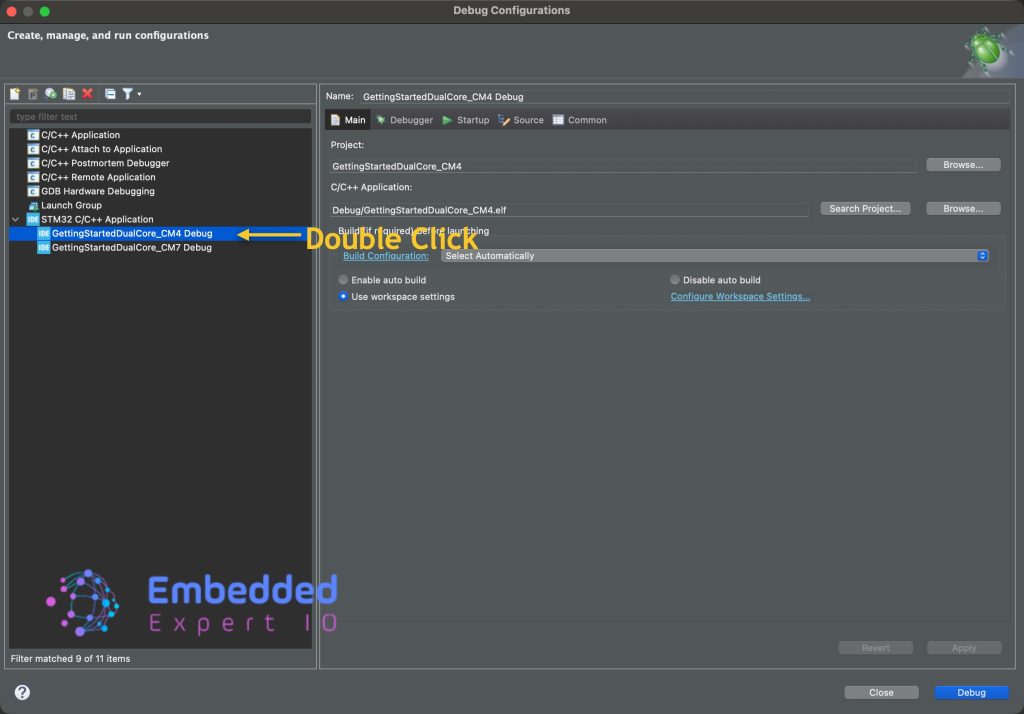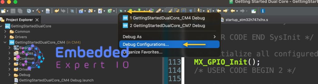 Next, launch another debugger session for the CM4 part by clicking on down arrow and select debug configuration as follows: