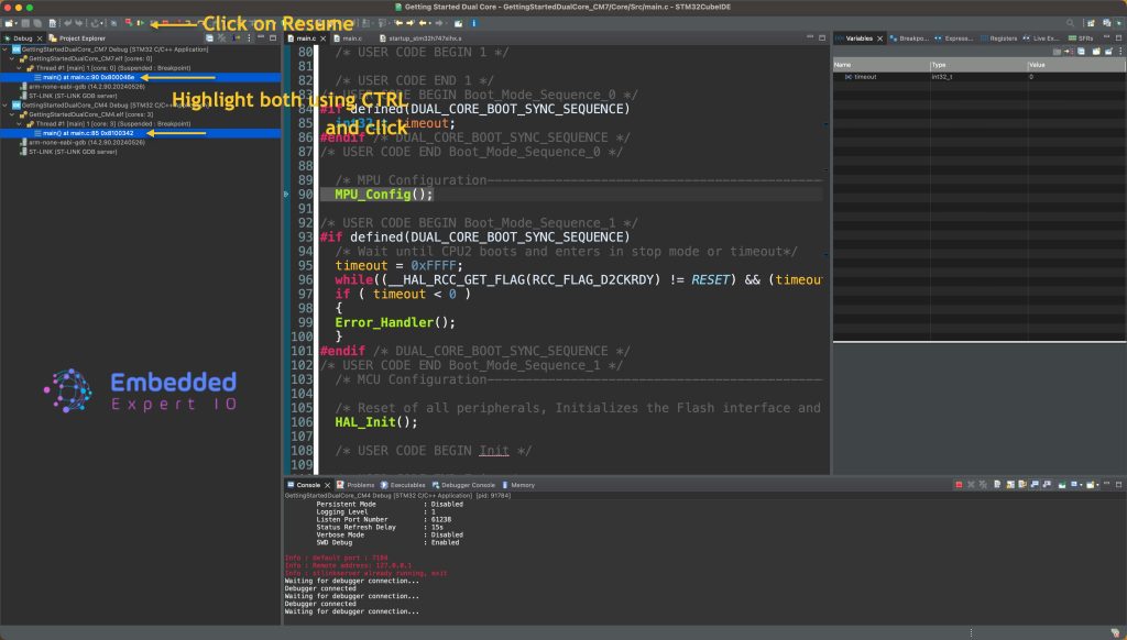 Now, you can debug both core by setting breakpoints, observe memory etc.