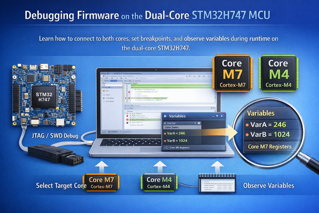 In this second part, the guide focuses on debugging firmware on the dual-core STM32H747 with particular emphasis on observing variables during runtime. It explains how to attach the debugger to each core, inspect memory and registers, and track variable changes to verify correct system behavior.