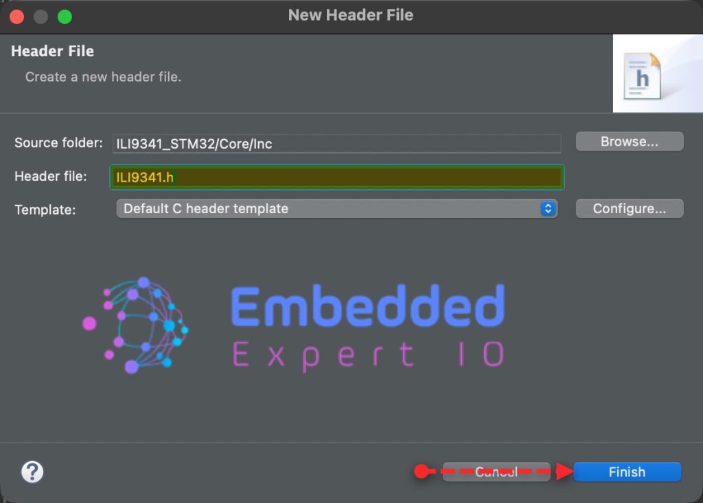 In similar manner, right click on Inc folder and add new header file with name of ILI9341.h as follows: