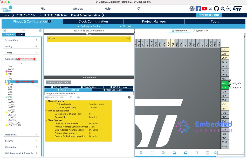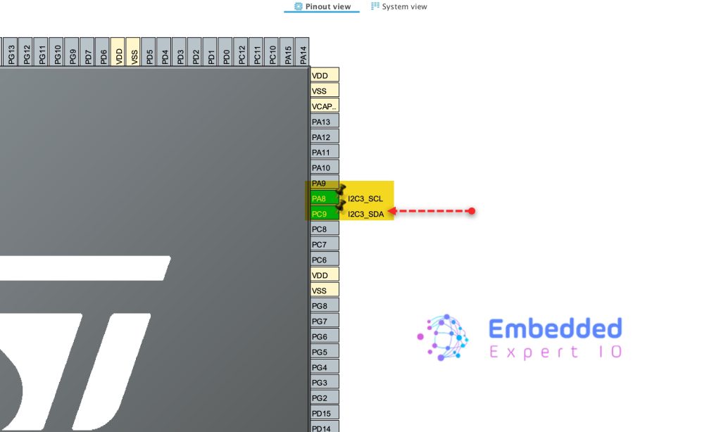 Hence, we need to enable PA8 and PC9 as I2C3_SCL and I2C3_SDA respectively as follows: