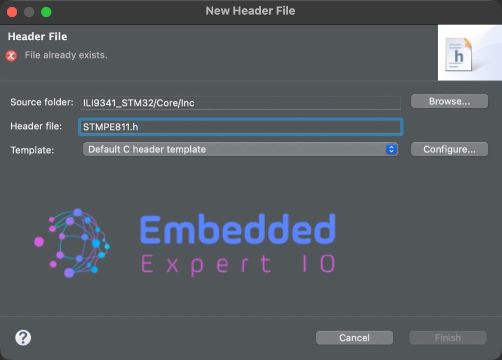 In similar manner, right click on Inc folder and add new header file with name of STMPE811.h as follows: