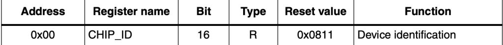 #define STMPE811_REG_CHIP_ID 0x00 /*Chip ID Register*/ #define STMPE811_REG_ID_VER 0x01 /*ID Revision Register*/ #define STMPE811_REG_SYS_CTRL2 0x04 /*Clock control*/ #define STMPE811_REG_SYS_CTRL1 0x03 /*Reset control*/ #define STMPE811_REG_IO_AF 0x17 /*Alternate function register*/ #define STMPE811_REG_ADC_CTRL1 0x20 /*ADC control*/ #define STMPE811_REG_ADC_CTRL2 0x21 /*ADC control*/ #define STMPE811_REG_TSC_CFG 0x41 /*Touch Configuration*/ #define STMPE811_REG_FIFO_TH 0x4A /*FIFO threshold*/ #define STMPE811_REG_FIFO_STA 0x4B /*FIFO status*/ #define STMPE811_REG_TSC_FRACT_XYZ 0x56 /*Touchscreen controller FRACTION_Z*/ #define STMPE811_REG_TSC_I_DRIVE 0x58 /*Touchscreen controller drive*/ #define STMPE811_REG_TSC_CTRL 0x40 /*touchscreen controller control register*/ #define STMPE811_REG_INT_CTRL 0x09 /*Interrupt control register*/ #define STMPE811_REG_INT_EN 0x0A /*Interrupt enable register*/ #define STMPE811_REG_INT_STA 0x0B /*Interrupt status register*/ #define STMPE811_REG_TSC_DATA_INC 0x57 /*Touchscreen controller DATA Incremental*/ #define STMPE811_REG_TSC_DATA_NON_INC 0xD7 /*Touchscreen controller DATA Non-Incremental*/ #define STMPE811_REG_FIFO_SIZE 0x4C /*FIFO size*/ /*IO expander facilities*/ #define STMPE811_ADC_FCT 0x01 #define STMPE811_TS_FCT 0x02 #define STMPE811_IO_FCT 0x04 #define STMPE811_TEMPSENS_FCT 0x08 /* Touch Screen Pins definition */ #define STMPE811_TOUCH_YD STMPE811_PIN_7 #define STMPE811_TOUCH_XD STMPE811_PIN_6 #define STMPE811_TOUCH_YU STMPE811_PIN_5 #define STMPE811_TOUCH_XU STMPE811_PIN_4 #define STMPE811_TOUCH_IO_ALL 0x00 /* IO Pins definition */ #define STMPE811_PIN_0 0x01 #define STMPE811_PIN_1 0x02 #define STMPE811_PIN_2 0x04 #define STMPE811_PIN_3 0x08 #define STMPE811_PIN_4 0x10 #define STMPE811_PIN_5 0x20 #define STMPE811_PIN_6 0x40 #define STMPE811_PIN_7 0x80 #define STMPE811_PIN_ALL 0xFF #define STMPE811_TS_CTRL_ENABLE 0x01 #define STMPE811_TS_CTRL_STATUS 0x80