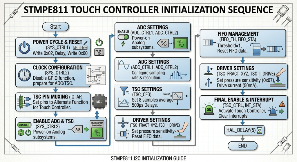 This initialization function prepares the STMPE811 to act as a dedicated touch co-processor, offloading the heavy lifting of signal processing from your STM32.