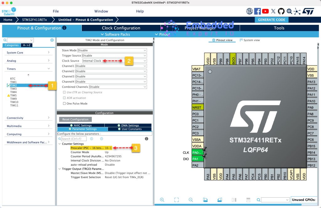 Next, we need to configure a timer to generate microseconds delays to bit-bang the protocol. From Timers, select TIM2 and configure it as following: