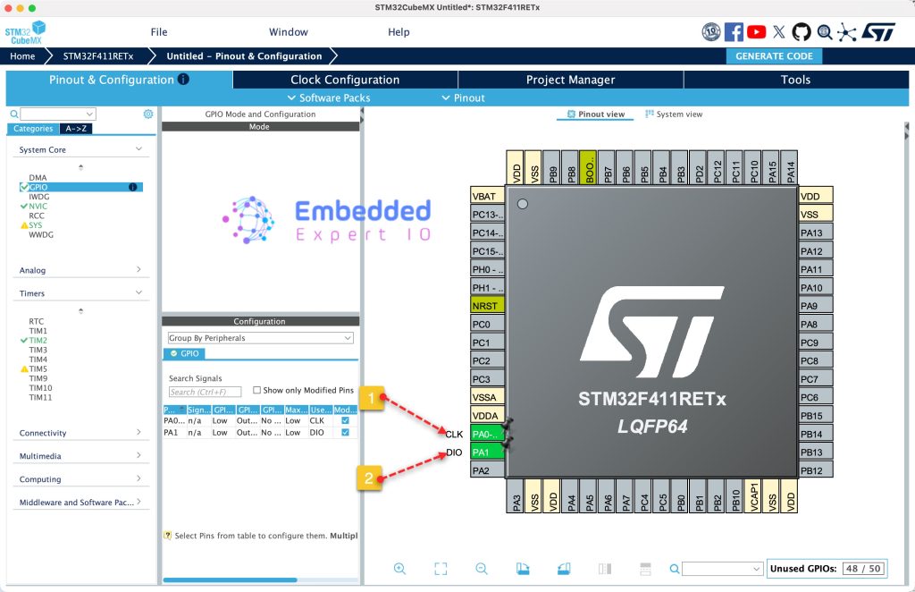 Next, from Pinout View, set PA0 and PA1 as output and give them label with name of CLK and DIO respectively as follows:
