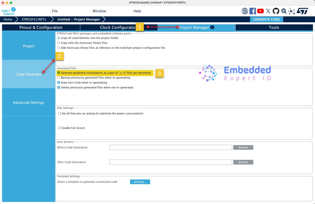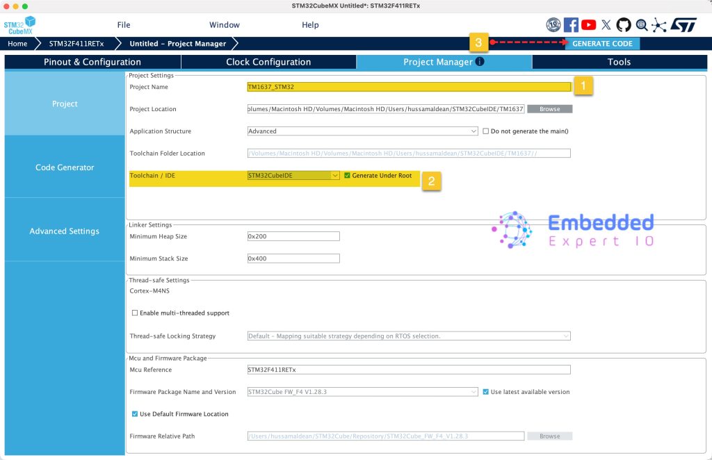 Next, from Project tab in Project Manager, give the project a name, set the Toolchain/IDE to STM32CubeIDE and click on Generate Code as follows: