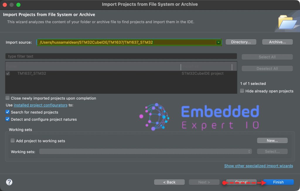 Next, select the folder that contains the .ioc file and click on Finish as follows: