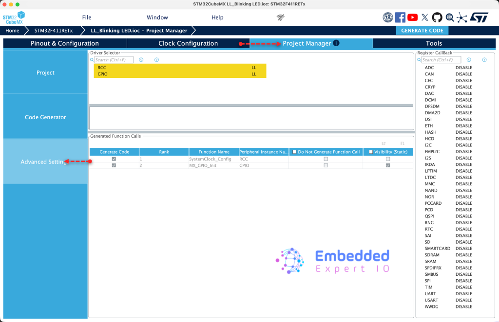Next, from Project Manager, head to Advanced Settings, set both RCC and GPIO to LL as follows: