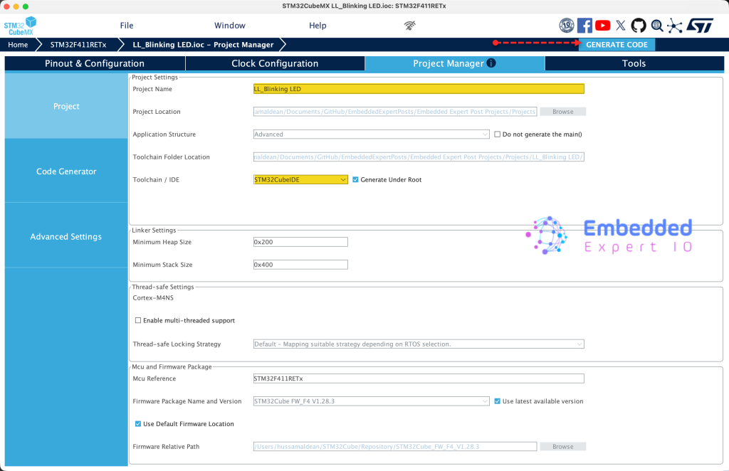 Next, from Project, give the project a name and set toolchain/IDE to STM32CubeIDE and click on Generate Code as follows: