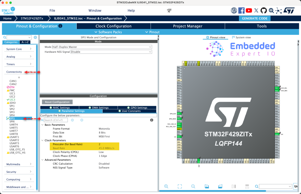 From connectivity, select SPI5 and set the orescaler to 2. This will provide 45Mbps transfer speed as follows:
