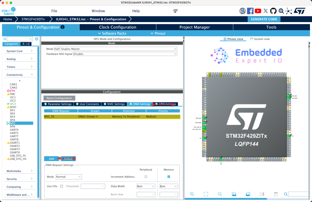 Next, from DMA settings, enable DMA for SPI5_TX as follows: