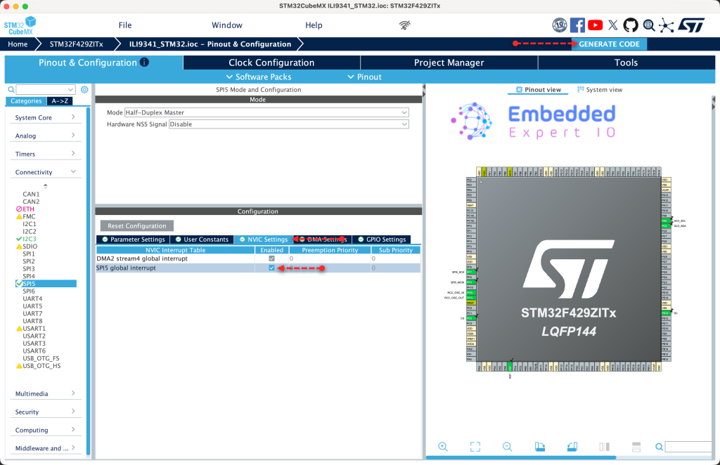 Finally, enable SPI5 global interrupt and generate code as follows: